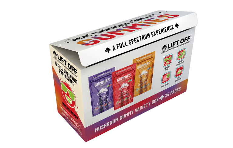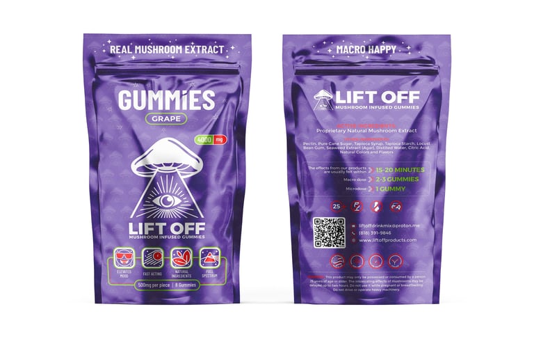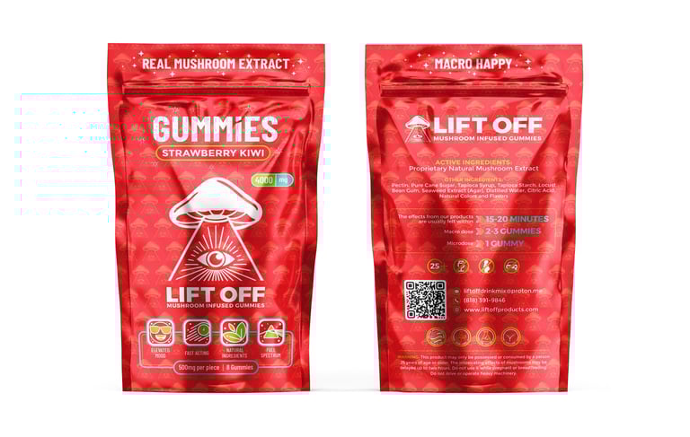 Our proprietary mushroom infused gummies come in our most popular flavor of Strawberry Kiwi. These gummies are easy to dose coming in a pack of 8 gummies that are 0.5grams each. Take 1 for a microdose or 2 for a macro dose. Just like other Lift Off products the effects will be felt quickly, usually between 15-20 minutes and last for about 3-4 hours. Effects do vary from person to person.